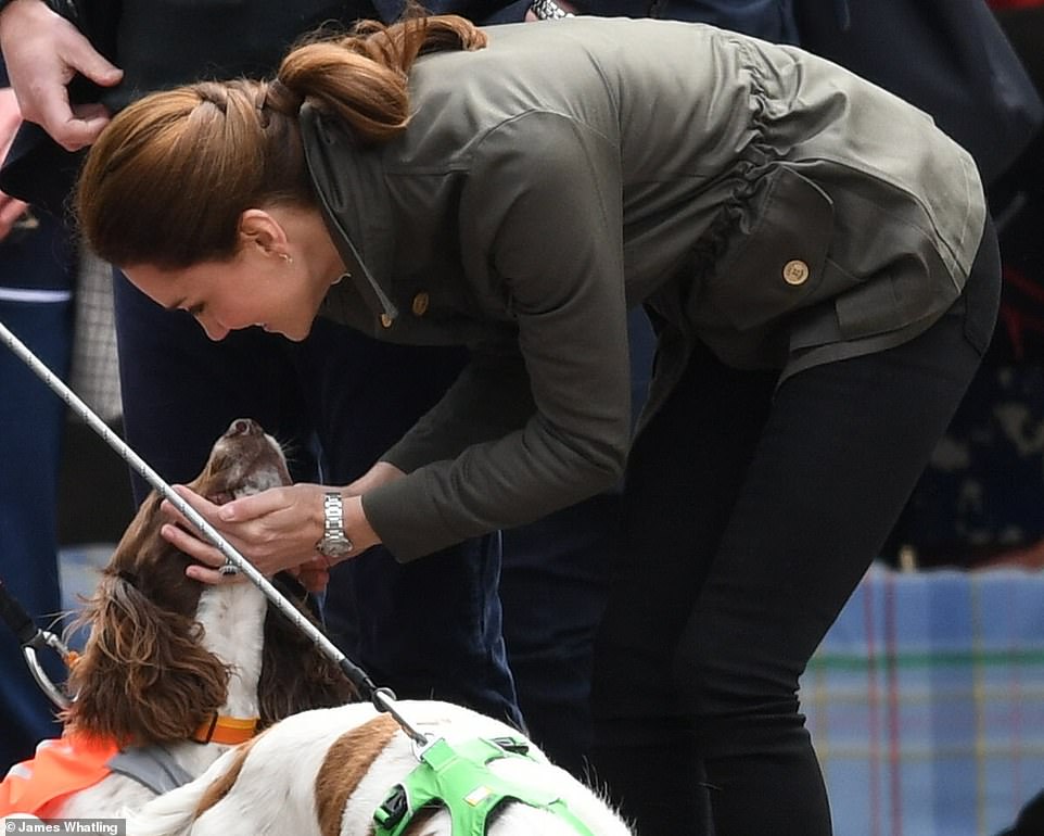 Однако, Кейт выглядела особенно занятой четвероногими королевскими поклонниками, и даже на несколько минут задержалась, чтобы погладить трех нетерпеливых спаниелей — к большому удовольствию собак.