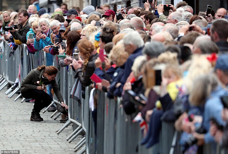 Герцогиня, одетая по этому случаю в жакет от Troy London (за 275 фунтов стерлингов) и ботинки на шнуровке от Chloe (250 фунтов стерлингов), сияла, разговаривая с королевскими фанатами, собравшимися на Рыночной площади.