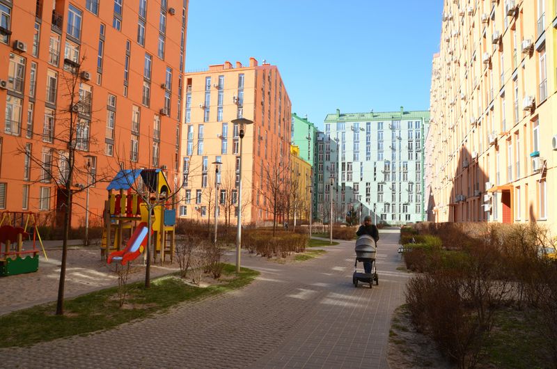 В Киеве, дома 1960-х и 70-х годов с возрастом стали ветхими, окруженными грязными, усеянными сорняками и мусором дворами, металлическими гаражами и скрипучими детскими игровыми площадками.