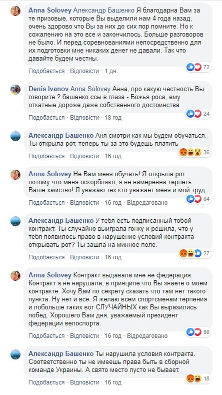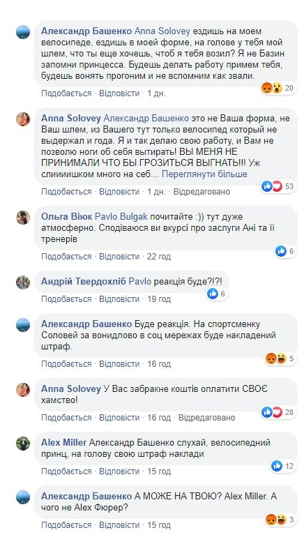Украинская велосипедистка Анна Соловей, которая выиграла "золото" Европейских игр в Беларуси в соцсетях поссорилась с президентом Федерации велоспорта Украины Александром Башенко, который публично ей нахамил.
