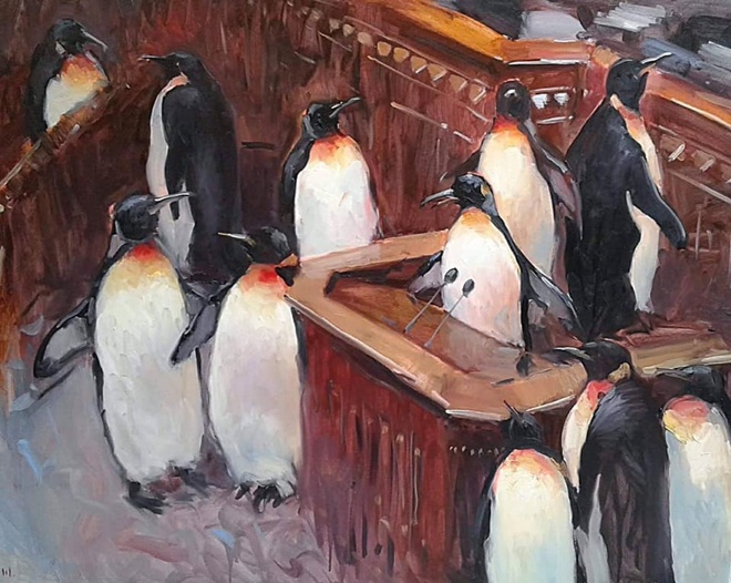 - Холст с пингвинами я написал два года назад для саркастичной выставки на злобу дня, - рассказывает нам Юрий. - Там были пингвины в Верховной Раде, люди у бассейна, где вместо воды грядки с помидорами, и другие. Я размышлял тогда на остросоциальные темы. И вот пингвинами у трибуны мне увиделись наши политики.