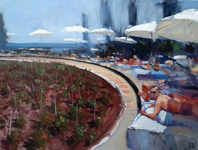 - Люди на лежаках у бассейна - это о том, какие у нас разные денежные возможности, о расслоении общества в нашей стране, - объясняет сюжет Юрий. - Когда постоянно живешь в Киеве, это не так ощущается, а выезжаешь в села и райцентры - сразу другой мир. А бабушки на гироскутерах… Я как-то подумал: вот бы инвалидам такую технику выдавали. Насколько бы их жизнь стала проще.