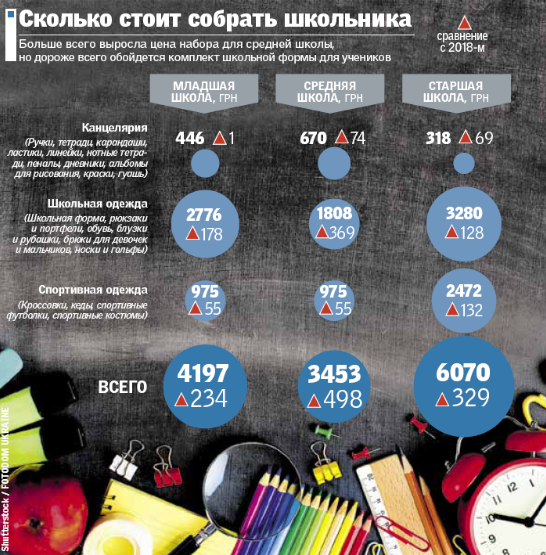 По данным маркетплейса Prom.ua, в этом году за полный сбор пятиклассника в школу родителям придется выложить порядка 3,5 тыс. грн. Этот примерно на 500 грн больше по сравнению с 2018-м (см. инфографику). Причем больше всего придется выложить за набор толстых тетрадей (255 грн — 15 шт.), рюкзак (478 грн), демисезонную обувь (370 грн), детскую рубашку (295 грн), так как за год эти товары в среднем подорожали на 80—130 грн.