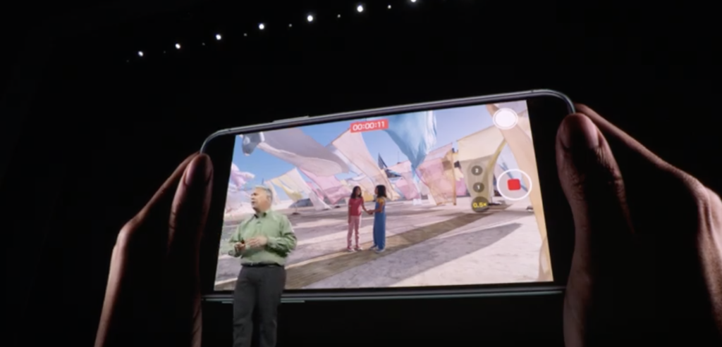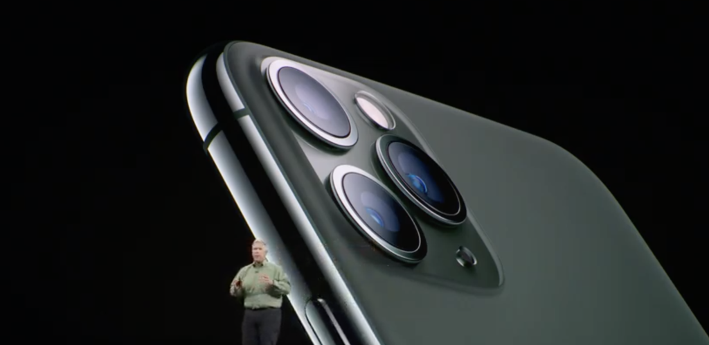 iPhone 11 Pro имеет три камеры — с телеобъективом, обычная (которую Apple называет широкоугольной), и камера с широкоугольным объективом (поле зрения — 120 градусов). Все три камеры снимают видео в 4K/60 кадров в секунду.