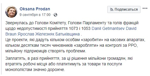 Среди тех, кто раскритиковал законопроекты, в частности, - глава всеукраинского объединения малого и среднего бизнеса "Фортеця" Оксана Продан, которая в прошлом созыве Верховной Рады входила в состав комитета по вопросам налоговой и таможенной политики. На своей странице в Facebook она написала, что обратилась к руководству парламента, профильного комитета и к лидерам депутатских фракций с призывом не допустить принятия этих документов. По ее словам, указанные законопроекты дадут возможность "нескольким лицам "заработать" на кассовых аппаратах, нескольким десяткам тысяч чиновников "зарабатывать" на контроле за РРО, миллиону предпринимателей создадут проблемы". "Заплатят, в случае принятия, за эти решения миллионы граждан, которые потеряют рабочие места или будут платить за товары и услуги монополистам значительно дороже", - отметила она.