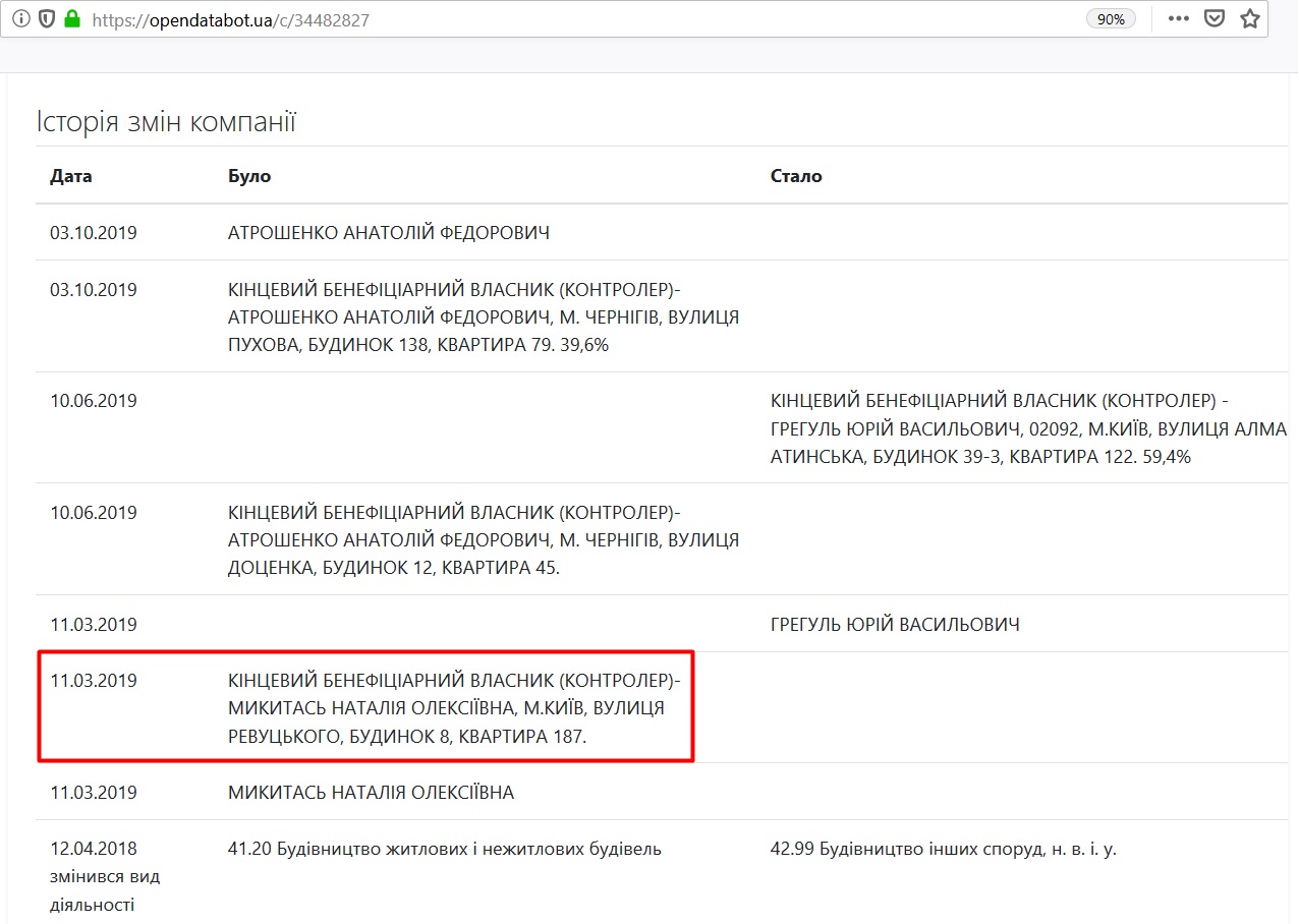 Согласно открытым данным Opendatabot, до 11 марта 2019 года конечным бенефициарным собственником компании ООО «Укрбудмонтаж» значилась Наталья Микитась, супруга Максима Микитася. Директором строителей был все тот же Андрей Якусевич.