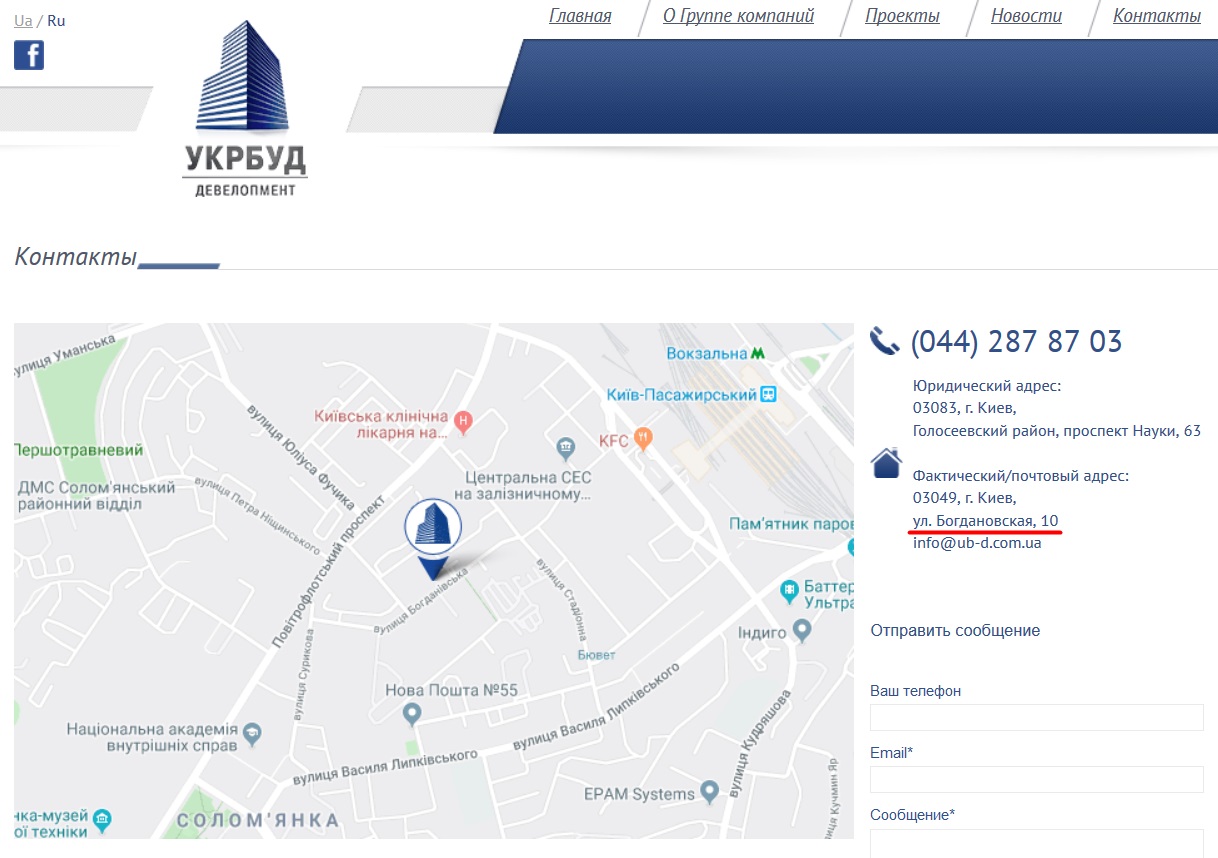 На сайте группы компаний «Укрбуд девелопмент» указан фактический почтовый адрес в столице – ул. Богдановская, 10. Однако на самом здании нет никакой вывески либо другой информации об ООО «Северо-украинский строительный альянс». Тем не менее, присутствие фирмы по этому адресу выдают внедорожники Lexus и Mercedes братьев Якусевичей, припаркованные рядом.