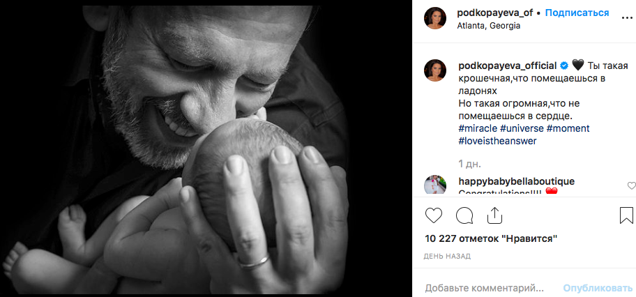 "Ты такая крошечная, что помещаешься в ладонях. Но такая огромная, что не помещаешься в сердце", - подписала фотографию Подкопаева.