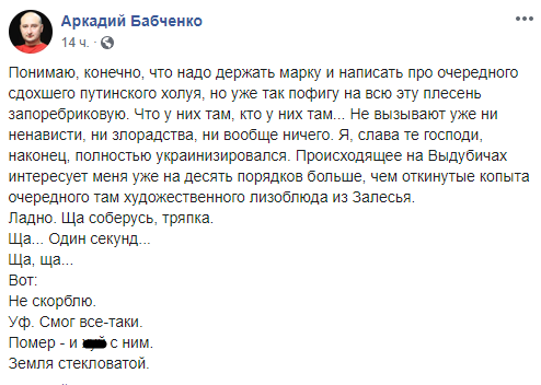 "Что у них там, кто у них там... Не вызывают уже ни ненависти, ни злорадства, ни вообще ничего. Я, слава те господи, наконец, полностью украинизировался. Происходящее на Выдубичах интересует меня уже на десять порядков больше, чем откинутые копыта очередного там художественного лизоблюда из Залесья. Не скорблю. Помер - и *уй с ним. Земля стекловатой", - отметил он.