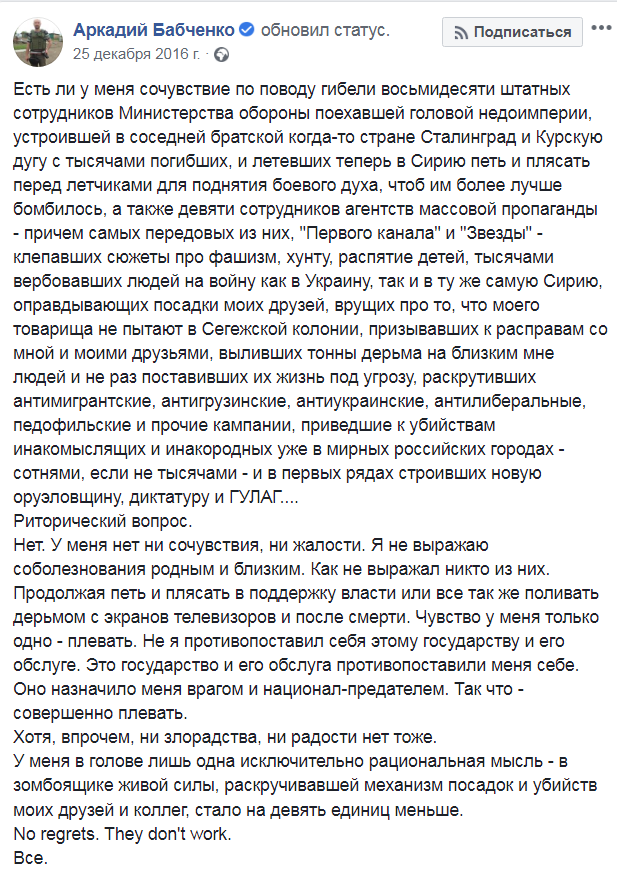 "Есть ли у меня сочувствие по поводу гибели восьмидесяти штатных сотрудников Министерства обороны поехавшей головой недоимперии?.. Нет. У меня нет ни сочувствия, ни жалости. Я не выражаю соболезнования родным и близким... Чувство у меня только одно – плевать. Не я противопоставил себя этому государству и его обслуге. Это государство и его обслуга противопоставили меня себе... У меня в голове лишь одна исключительно рациональная мысль – в зомбоящике живой силы, раскручивавшей механизм посадок и убийств моих друзей и коллег, стало на девять единиц меньше", – написал Бабченко на Facebook.