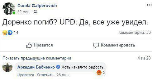 "Хоть какая-то радость", – написал Бабченко под сообщением о гибели Доренко, опубликованным российским журналистом Данилой Гальперовичем.