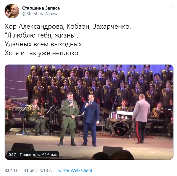В 2018 году беглый журналист порадовался похоронам умершего после болезни певца, депутата Госдумы РФ Иосифа Кобзона и погибшего в результате покушения главы т.н. "ДНР" Александра Захарченко. Прощание с обоими проходило в Москве и Донецке почти одновременно 31 августа.