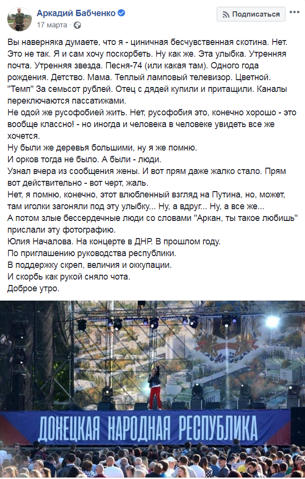 "Вы наверняка думаете, что я – циничная бесчувственная скотина. Нет. Это не так. Я и сам хочу поскорбеть. Ну как же. Эта улыбка. Утренняя почта. Утренняя звезда. Песня-74 (или какая там). Одного года рождения. Детство. Мама. Теплый ламповый телевизор... А потом злые бессердечные люди со словами "Аркан, ты такое любишь" прислали эту фотографию. Юлия Началова. На концерте в "ДНР". В прошлом году. По приглашению руководства республики. В поддержку скреп, величия и оккупации. И скорбь как рукой сняло чота", – высказался Бабченко.