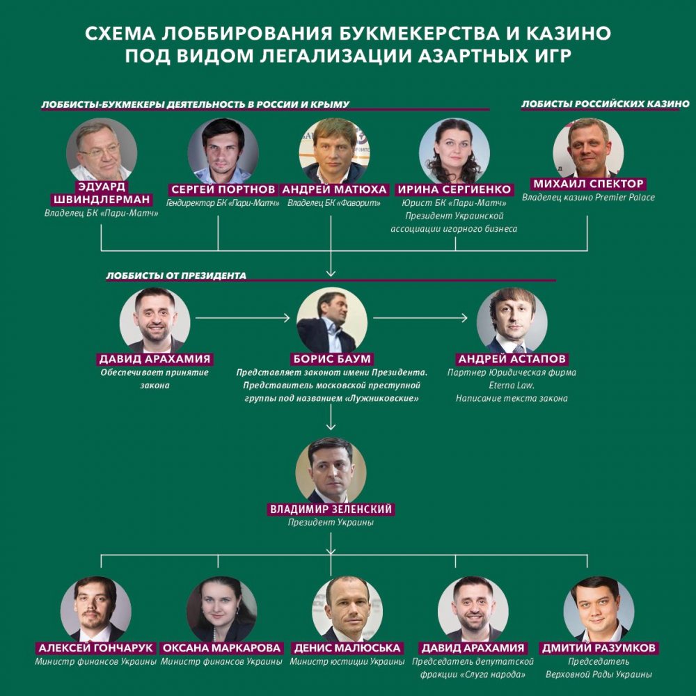 С украинской стороны официальным спикером и лоббистом законопроекта о легализации игорного бизнеса является Давид Арахамия, глава парламентской фракции "Слуга народа". Он одним из первых начал готовить общественное мнение к тому, что запрет на игорный бизнес ни к чему не привел, поэтому легализация — прямой путь к пополнению бюджета. И с этим трудно не согласиться. Другое дело, что этот законопроект написан таким образом, что если бы в нем было написано, что все привилегии и преференции должна получить компания, название которой начинается на слово "пари", а заканчивается на слово "матч", то это было бы и честно, и точно.