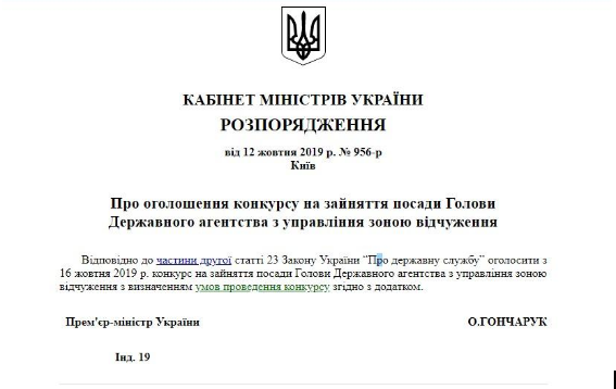 Известно, что Кабинет министров Украины своим распоряжением от 12 октября 2019 года № 956-р за подписью премьер-министра Гончарука объявил конкурс на занятие должности председателя Государственного агентства по управлению зоной отчуждения (ДАЗВ – Укр.). Наши журналисты обратили свое внимание на этот конкурс не случайно, так как речь идет об очень важных вещах, таких, как достройка нового защитного саркофага над 4-м реактором ЧАЭС и распределении миллиардов бюджетных (читай – наших с вами) средств.