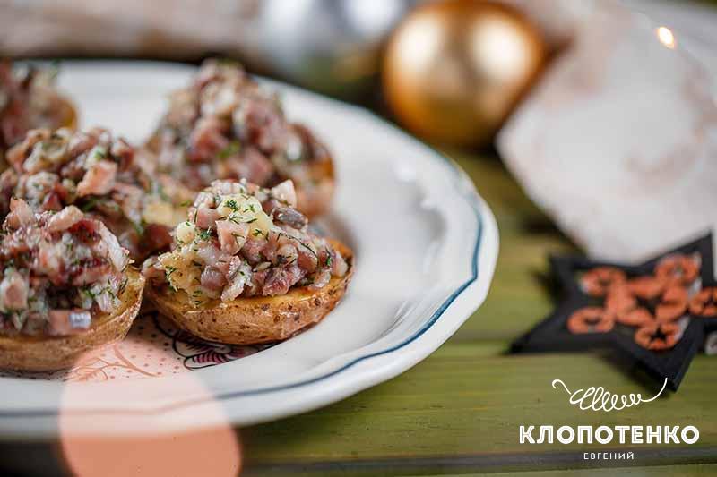 Начнем с рецептов новогодних закусок. Картофельные лодочки, запеченные в духовке – классическая праздничная закуска, которую любят очень многие. Как правило, картофель запекают с салом. Это неплохой вариант, но я предлагаю просто запечь картофель в форме лодочек и подать его вместе с маринованной сельдью.