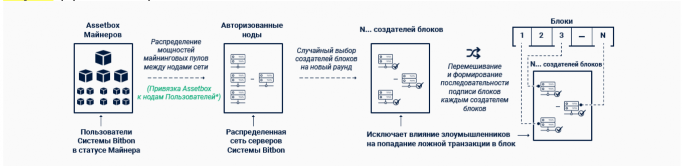 «Чтобы заработать на майнинге в системе Bitbon нет надобности в приобретении всевозможного дополнительного оборудования (процессоров и видеокарт с большой вычислительной мощностью, ферм для майнинга и т. д.). Майнинг обеспечения консенсуса использует алгоритм Community Proof-of-Stake, который был серьезно доработан и отличается от тех, что уже существуют на рынке. Каждый владелец Bitbon сможет участвовать в майнинге и получать постоянный доход в объеме, который будет напрямую зависеть от количества имеющихся Bitbon на его электронном кошельке Assetbox».
