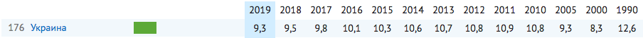 Україна займає 176 місце у рейтингу народжуваності населення. Найменше скорочення населення Україна мала у 2011 році, коли ВВП сягнув $183 млрд, а найбільше - у 2000 році, через рік після досягнення цим показником мінімуму за часи незалежності - $31 млрд. У 1990 році в Україні на 1 тисячу населення народжувалось 12,6 малюків, тоді як в 2019 році - лише 9,3.
