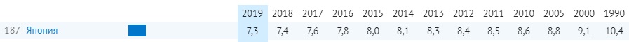 Японія - країна з найстарішим населенням у світі. Майже 28% японців - старше 65 років. Чисельність корінного населення Японії в 2019 році скоротилася на 512 тисяч осіб. У 2019 з'явилися на світ 864 тисяч дітей. Це 7.3% у рейтингу. При цьому смертність в Японії постійно росте. У 2019 році, за попередніми оцінками дослідників, вона досягла історичного максимуму в 1,37 млн осіб. У 2019 році у Японії на 1 тисячу населення народилось 7,3 малюків, тоді як у 1990 - 10,4. Японія займає 187 місце у рейтингу народжуваності.