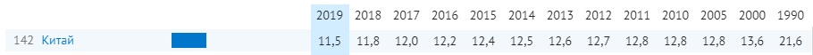 Аналогічна ситуація в Китаї, де народжуваність впала до найнижчої позначки з часів утворення Китайської Народної Республіки 70 років тому, не дивлячись на скасування правила "одна сім'я - одна дитина". У 2019 році в країні народилося 14,65 мільйонів дітей, що на 580 тисяч менше, ніж у попередньому, або ж 11,5 малюків на 1 тисячу населення. Згідно даних Національного агентства статистики, це найнижчий показник з 1949 року. Китай займає 142 місце у рейтингу народжуваності.