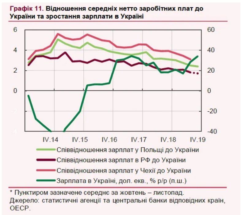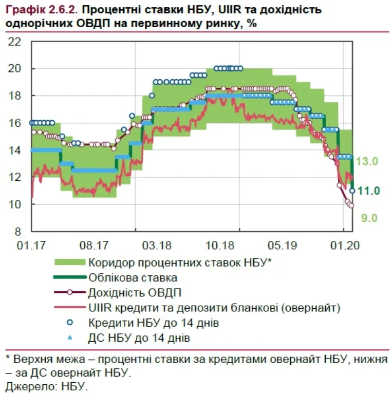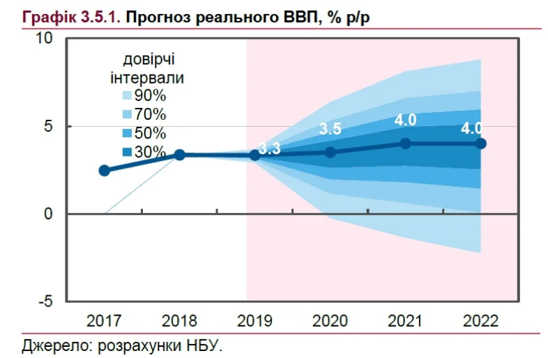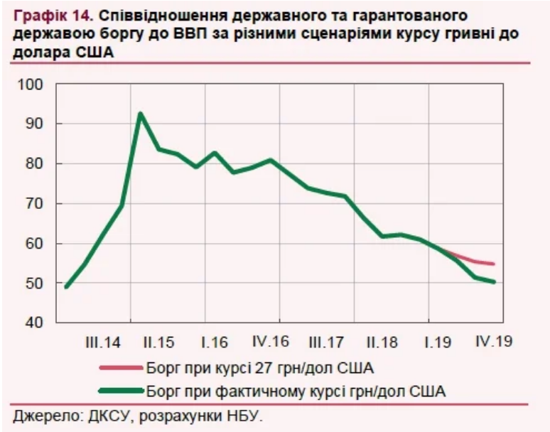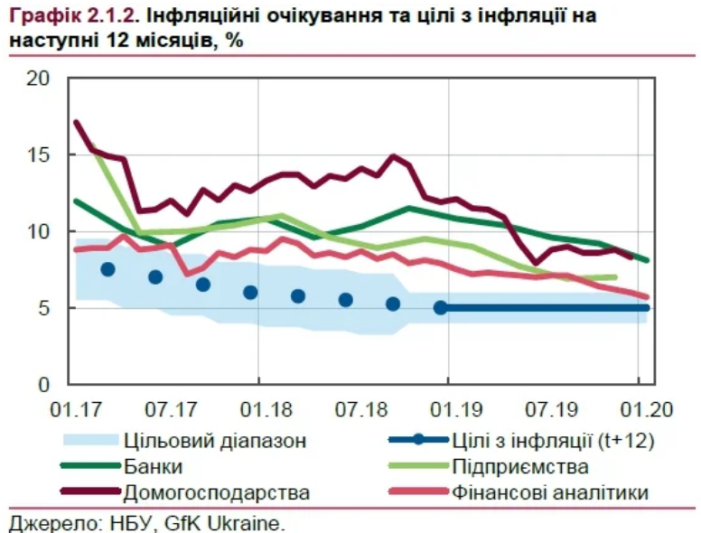 В НБУ ожидают, что эффект от укрепления курса гривни в 2019 году на более чем 14% проявится и в начале 2020 года. Вместе с низкими ценами на энергоносители он будет удерживать инфляцию ниже целевого диапазона в течение большей части 2020 года. В дальнейшем рост цен несколько ускорится и будет находиться у отметки 5%. (Такой показатель и является целью Нацбанка). В 2019 году потребительская инфляция замедлилась до 4.1% (с 9.8% в 2018 году) — самого низкого уровня за последние шесть лет.