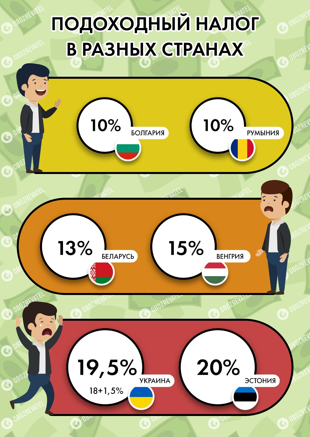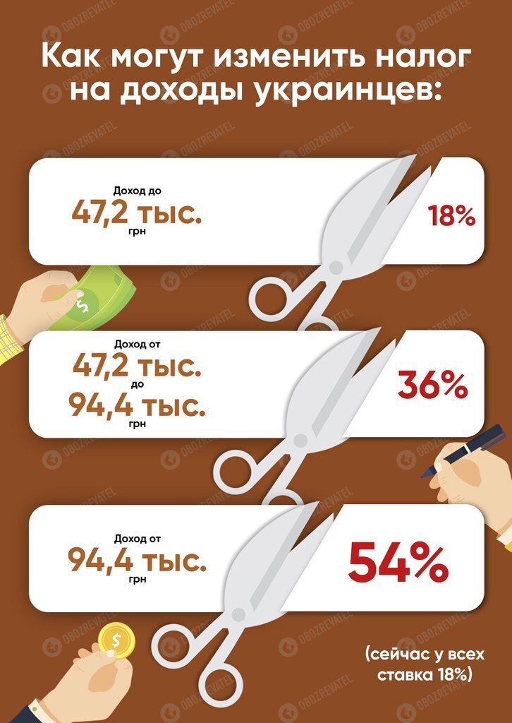 Почти в половине стран ЕС максимальная ставка налога – более 40%, а в 4 странах ставка налога равна или превышает 50%. У нас же все платят 18%. И с миллиона, и с пяти тысяч гривен. По новым же правилам будет действовать шкала: от 18 до 54%. Подробнее можно узнать, ознакомившись с инфографикой.