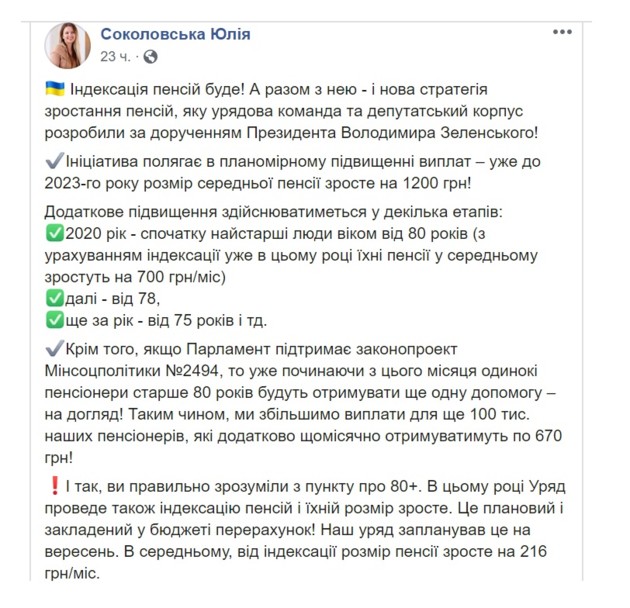 "В этом году правительство также проведет индексацию пенсий, и их размер вырастет. Это плановый и заложенный в бюджете перерасчет! Наше правительство запланировало это на сентябрь", – написала министр на своей странице в Facebook.