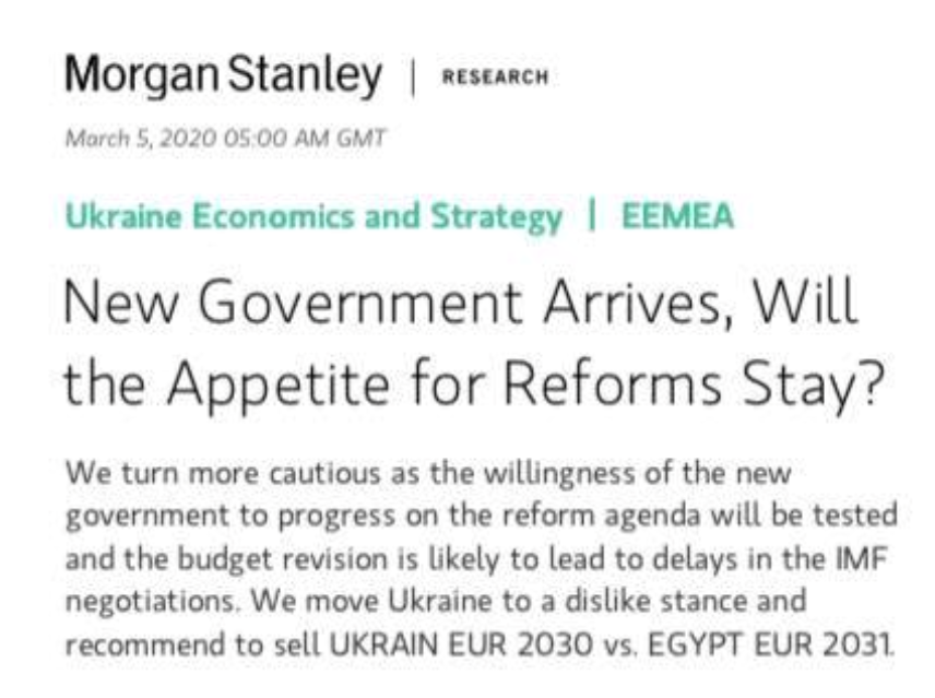 Имена Гончарука, Маркаровой, Милованова, Рябошапки и Сытника прямо указаны в отчете Morgan Stanley от 5 марта. В нем банкиры советуют клиентам сократить позиции в украинских еврооблигациях из-за неопределенности с новым правительством. "Мы рекомендуем продавать облигации Украина-2030 и покупать облигации Египет-2031", – говорится в документе.