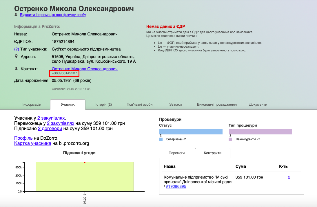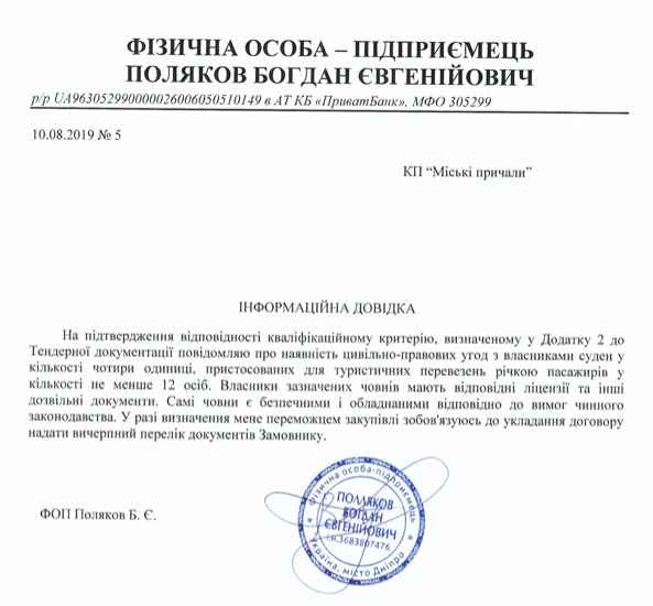 Договоры на оказание услуг по перевозке пассажиров речным транспортом на сумму 198 000 гривен и 1 800 000 гривен КП «Городские причалы» Днепровского горсовета заключило с ФЛП Поляков Богдан Валерьевич 5 августа и 28 августа 2019 года соответственно.