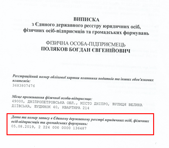 Данные о ФЛП Поляков Богдан Евгеньевич были внесены в Единый госреестр юрлиц и физлиц-предпринимателей 5 августа 2019 года. То есть четко в день заключения первого договора с КП «Городские причалы».