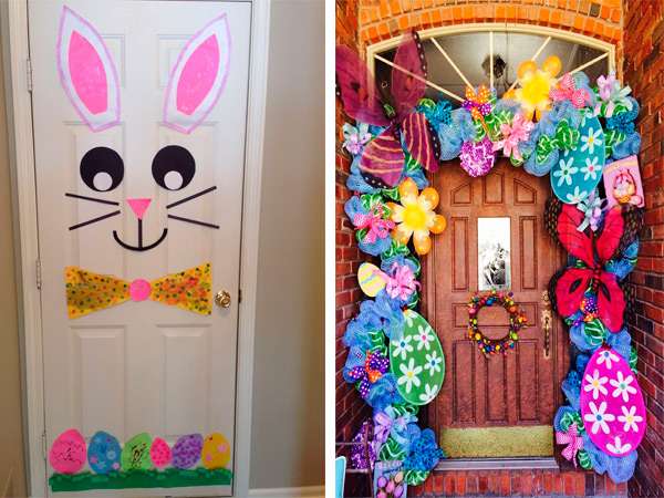 Украшенные двери – особый элемент Пасхального декора. Среди самых простых вариантов – мордочка кролика, цветы и даже воздушные шарики. Все это вырезается из картона и крепится на двухсторонний скотч.