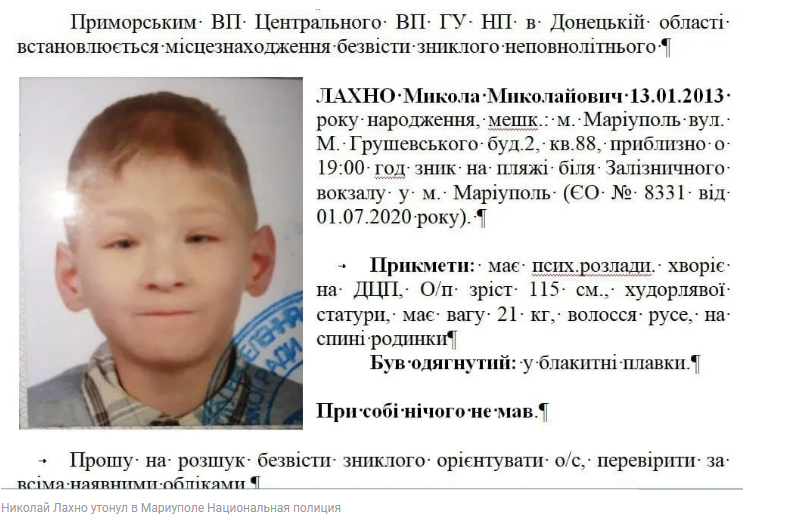 А 2 июля вечером в Мариуполе на пляже, недалеко от железнодорожного вокзала, пропал 7-летний Николай Лахно. Ребенок страдал ДЦП. Родители бросились его искать, вызвали полицию. Ребенка искали до самого утра. Однако тело мальчика обнаружил один из отдыхающих в 50 метрах от берега. Он буквально наступил на него. Оказалось, что это пропавший ребенок.