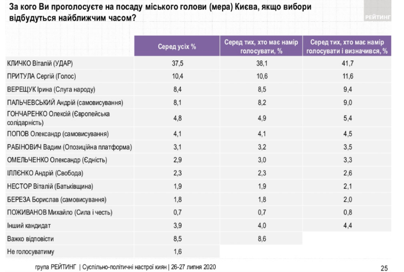 На третьем месте - выдвиженка "Слуги народа" Ирина Верещук с 9,4% голосов. На четвертом месте - телеведущий Андрей Пальчевский с 9% поддержки, который хоть и начал рекламную кампанию, официально о своем баллотировании еще не заявлял. Дальше в рейтинге с 5,4% голосов идет депутат от "Европейской солидарности" Алексей Гончаренко, которого пока официально на выборы мэра его политсила не выдвигала.