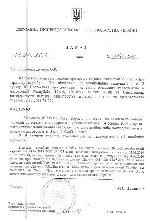 7 августа 2013 года сотрудниками УБОП Одесской области совместно с прокуратурой Одесской области были проведены обыски в служебной машине, офисе и на квартире руководителя Государственной сельскохозяйственной инспекции в Одесской области Ольги Демчук.