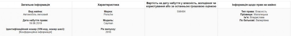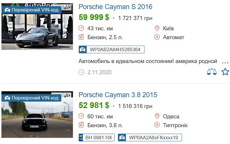 Porsche Cayman 2016 года выпуска, приобретен 19.06.2019 года. Цена согласно декларации 556 484 гривен. На сайте AUTO.RIA цена такого автомобиля колеблется в среднем от 50 000$ до 60 000$