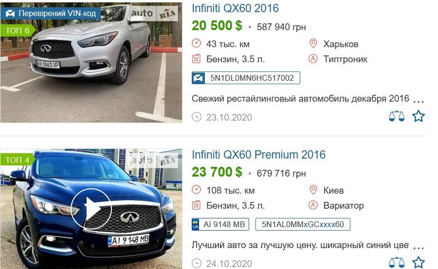 Infiniti QX60 2017 года выпуска, приобретен 18.11..2019 года. Цена согласно декларации 228 443 гривен. На сайте AUTO.RIA цена такого автомобиля колеблется в среднем от 20 000$ до 25.000$