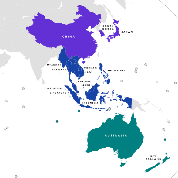 Торговое соглашение подписали Китай, Австралия, Новая Зеландия, Южная Корея, Япония, Бруней, Вьетнам, Индонезия, Камбоджа, Лаос, Малайзия, Мьянма, Сингапур, Таиланд и Филиппины.