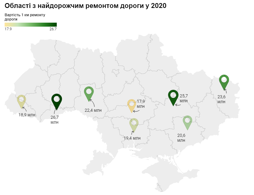 В некоторых областях ремонт 1 километра дороги обходится значительно дороже, чем средняя по Украине стоимость в 11 миллионов. Самые дорогие дороги в Днепропетровской области. Ремонт 1 километра в этом году обошелся в 26,7 миллиона гривен. Похожие расценки в Черновицкой (25,7 миллиона гривен), Луганской (23,6 миллиона гривен) и Винницкой областях (22,4 миллиона гривен).