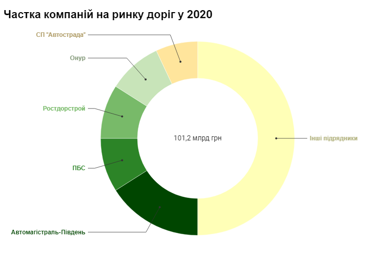 Кроме того, если внимательно изучить рынок дорожных подрядчиков, то действительно видно, что на рынке доминирует 5 компаний, но их суммарная доля на рынке - 50%. Остальные распределены между меньшими подрядчиками.