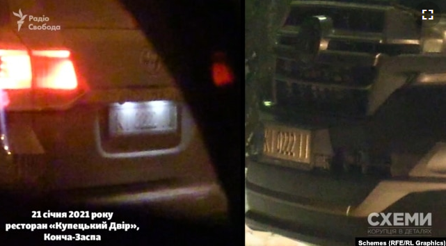 Журналісти зафіксували, як Land Cruiser, який раніше виїхав без номерів, повернувся на парковку закладу вже з ними і запаркувався на задньому дворі. Згодом з ресторану через кухню вибіг чоловік і швидко попрямував до машини.