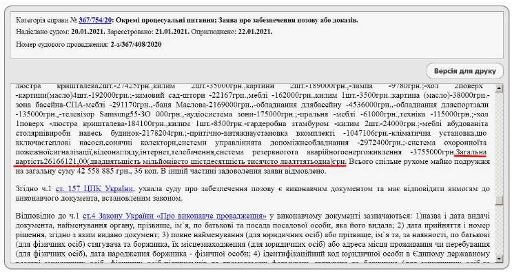 Сейчас Ирпенским городским судом Киевской области наложен арест на движимое имущество стоимостью более 26 миллионов гривен. Судя по решению суда, это имущество, которое находится внутри двух вилл в Ворзеле – мебель, предметы интерьера, бытовая техника и т.д. Информации об аресте непосредственно зданий загородного комплекса на данный момент нет.