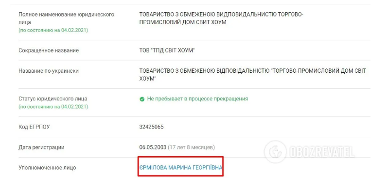 По информации OBOZREVATEL, Марина Ермилова является частным предпринимателем еще с 2003 года, также она уполномоченное лицо (контролер) в ООО "Торгово-промышленный дом Свит Хоум".
