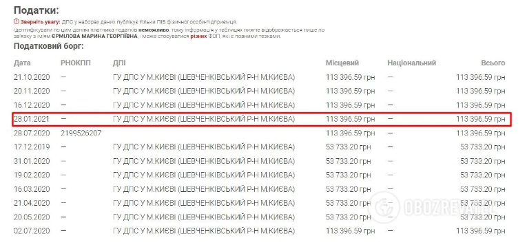 По информации из открытых источников видно, что ФОП Ермилова по данным Государственной фискальной службы является должником (а возможно и банкротом) и имеет значительный долг. Он стал накапливаться с мая 2020 года и на конец января 2021 составил 113 396.59 грн.