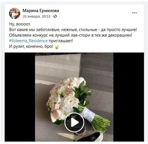 Отметим, несмотря на то, что Марина Ермилова не отвечает на звонки клиентов, она продолжает активно пользоваться социальными сетями. На своей странице в Facebook она также делает перепосты публикаций страницы ESTEEMA RESIDENCE.