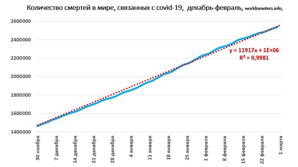 В течение июня-октября 2020 года в мире фиксировалось примерно 5,5 тысяч летальных исходов в сутки. В ноябре - 8,5 тысяч. В течение трех зимних месяцев - 12 тысяч. Но пиковые цифры (16 тысяч и более смертей в сутки) были пройдены в конце января еще до первых результатов массовой вакцинации. На сегодняшний день в мире привито около 230 миллионов человек и это, безусловно, ускоряет затухание второй волны.