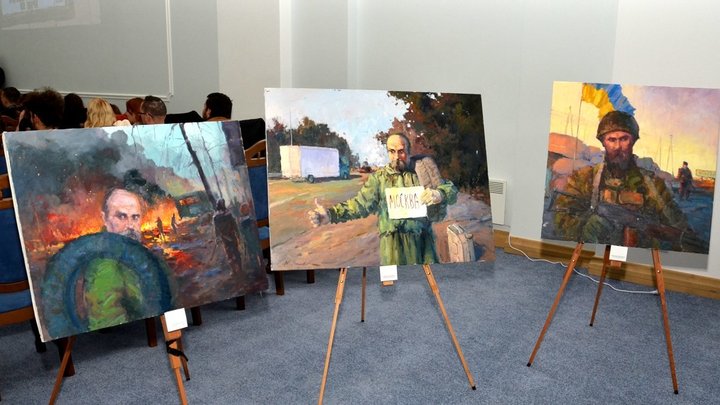 На этих картинах всем знакомый Тарас Шевченко, но в военной форме защитников Украины готовится к штурму Чонгара, несет покрышки на Майдан, планирует революцию в Москве и даже "набивает" Путину тату со всем известным рефреном.