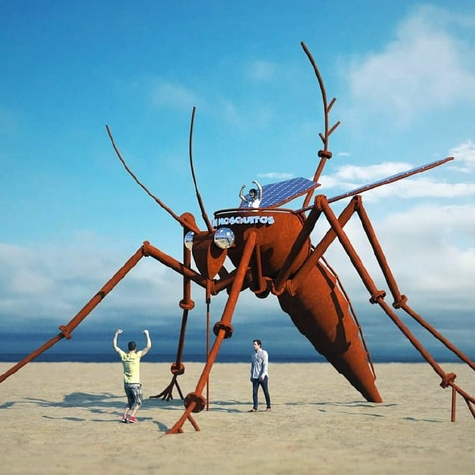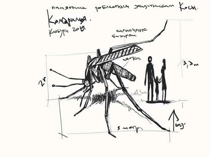 Неспроста образ защитника природы решили воплотить именно в виде насекомого: «Кому-то нравилось на косе, кому-то нет. Не понравится там может по ряду причин – там достаточно сурово (жара, комары, сложно перемещаться, ведь везде песок и т.д.). Для меня самого комары были каким-то наваждением по началу. Особенно в начале лета. Я учился приспосабливаться – рубашка с длинным рукавом, штаны, а не шорты. Они «кусали» без разбора и богатых, и бедных, воспитанных и нет. Появился образ в голове – комары-истинные «защитники» косы».