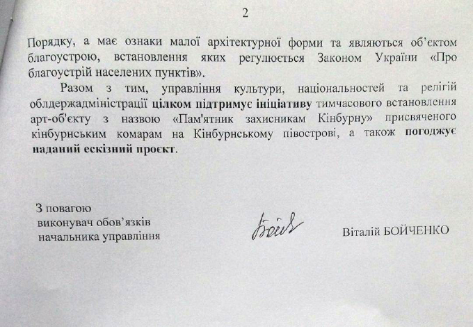 — Управление культуры Николаевской области без проблем согласовало нам установку Комара. Управление экологии ответило размыто. Но из ответа я понимаю, что нам предлагают ставить где-то на причале. Мы подумали, что на причале лучше поможем (хоть руками, хоть гривной) в установке навеса от солнца, цивилизованного туалета и урн.