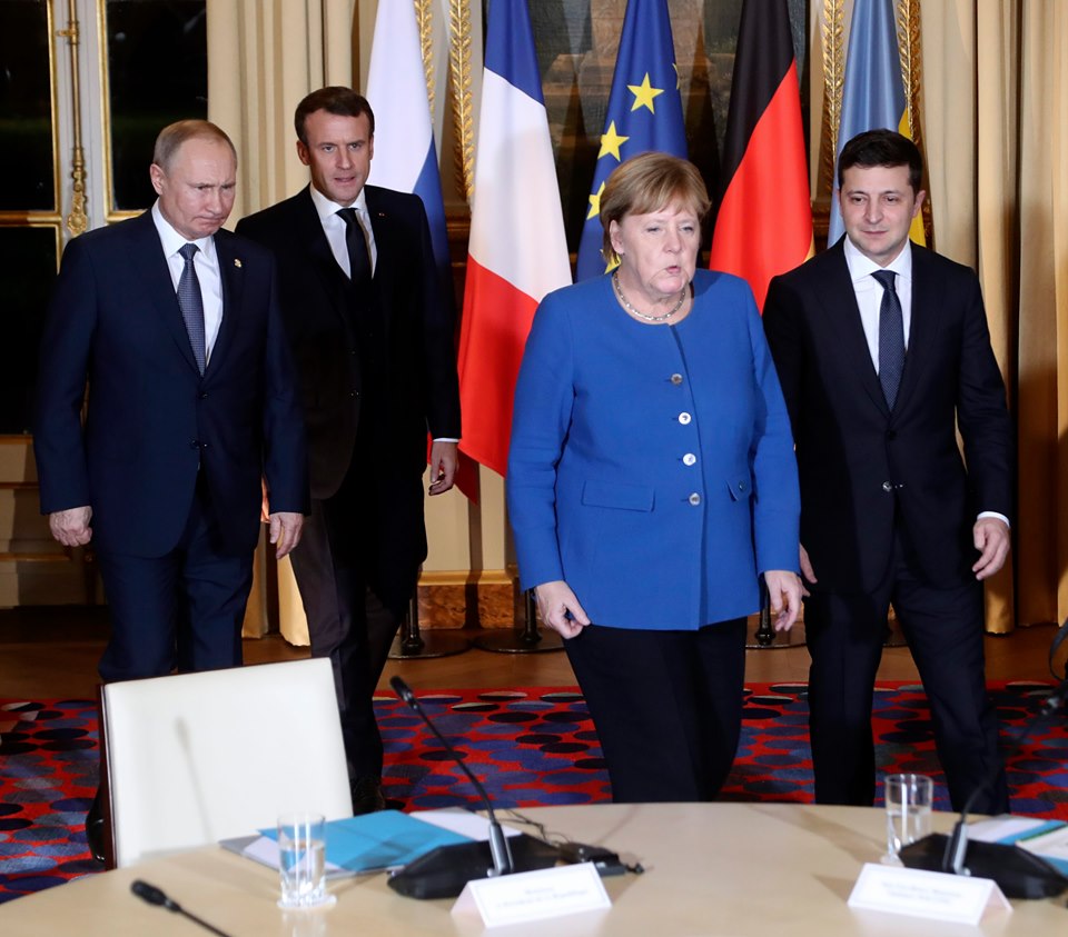 Владимир Зеленский, Эммануэль Макрона Ангела Меркель и Владимир Путин на встрече в Париже, 9 декабря 2019