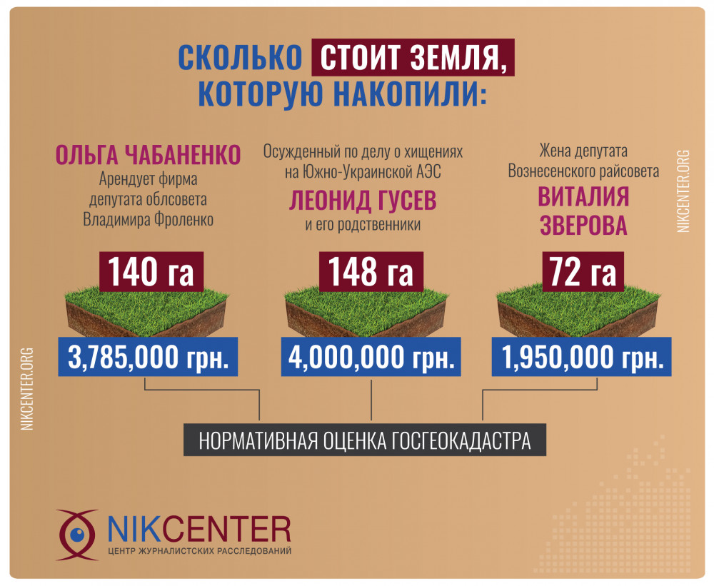 В ноябре 2019 года Госгеокадастр за один день отдал на приватизацию 62 га сельхозземель в Вознесенском районе, еще 10 - за один день месяцем позже. Вскоре все земельные участки попали в собственность гражданской супруги депутата от партии “ОПЗЖ” местного райсовета Виталия Зверова Ольги Ковальчук.